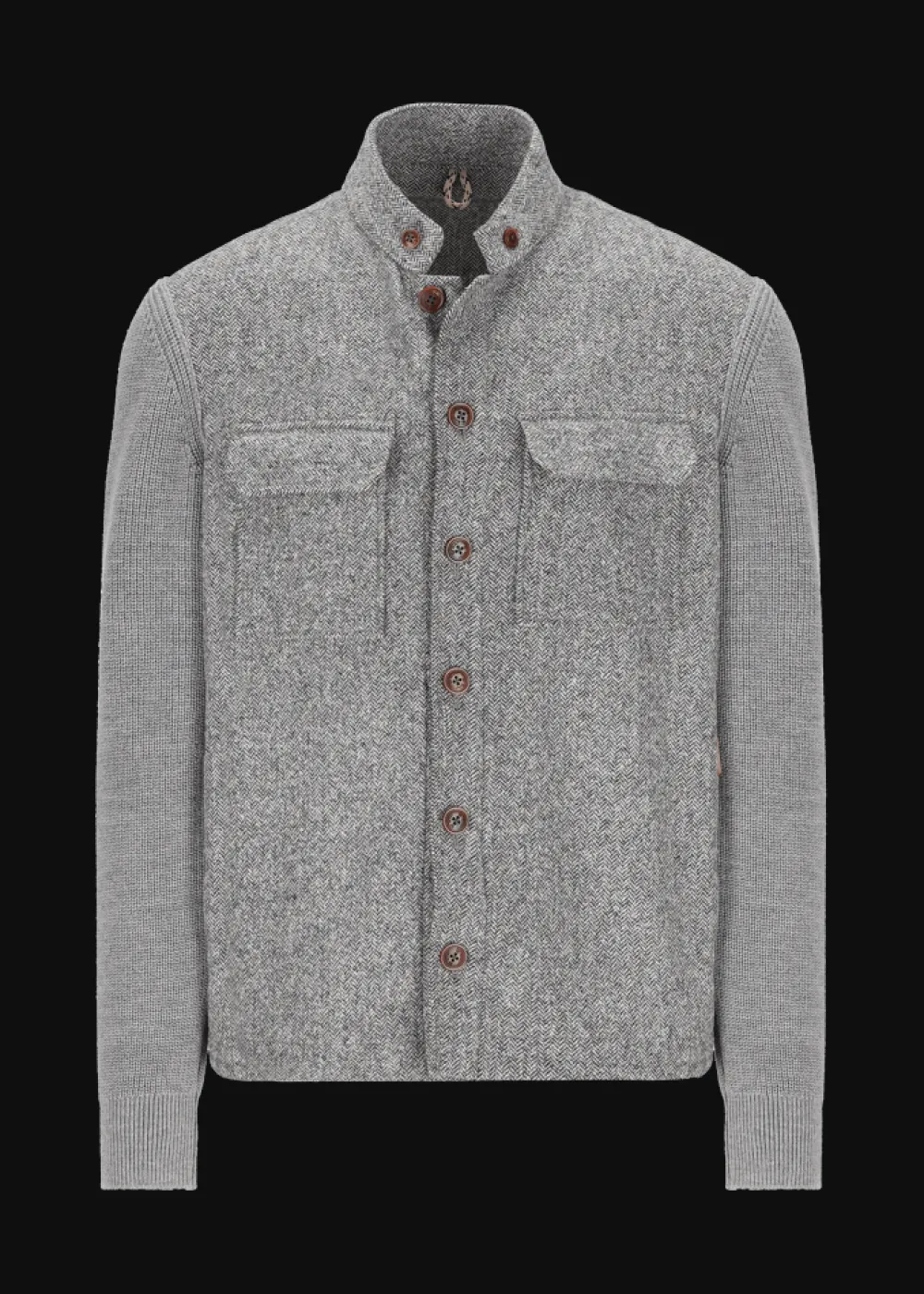 - Diese ungefütterte Hemdjacke im Comfort Fit mit Stehkragen besteht am Körper aus einer angenehmen Woll-Baumwoll-Mischung mit dezentem Fischgrätmuster, während die Ärmel aus reiner Wolle im Perl- und Rippstrick gefertigt sind.