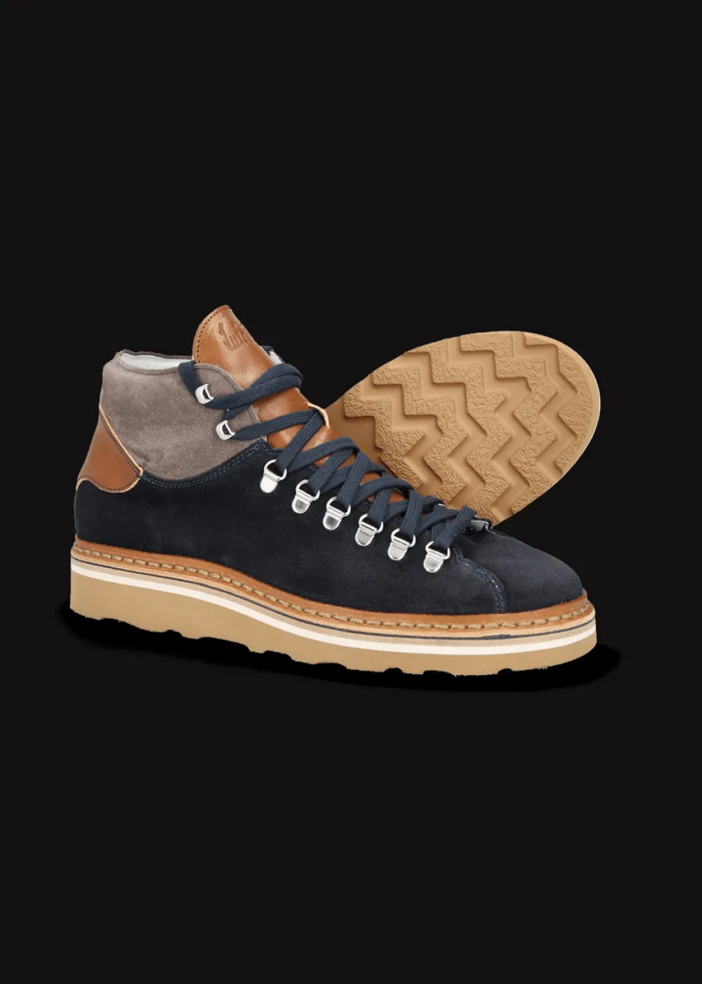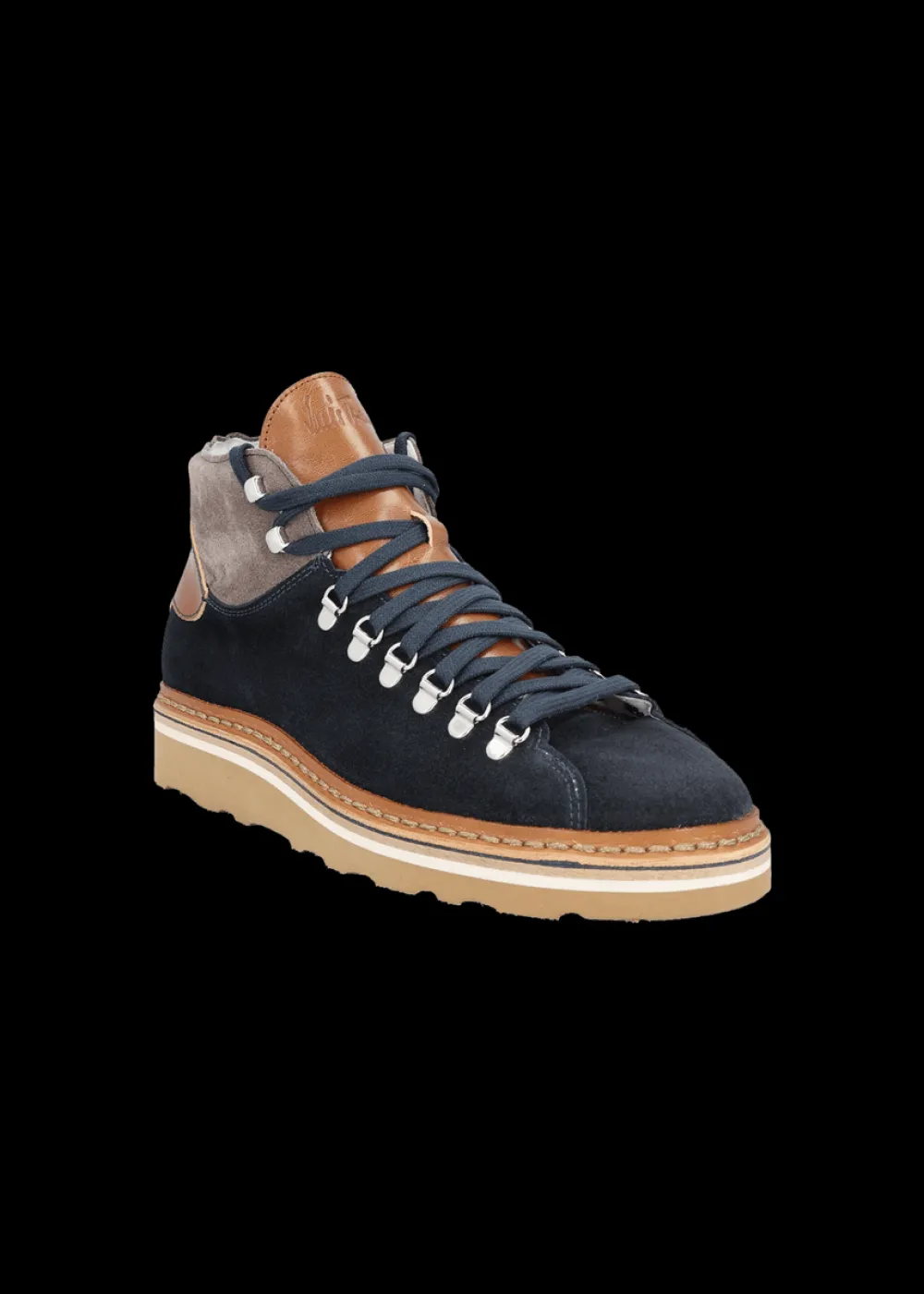 Innensohle: Atmungsaktive Kork-Einlegesohle - Besonderheiten: Quartier aus grauem Wildleder, Hinterkappe und Zunge aus Glattleder mit geprägtem Luis Trenker Logo, rahmengenähte Machart,in traditioneller Manufaktur in Italien von Hand gefertigt