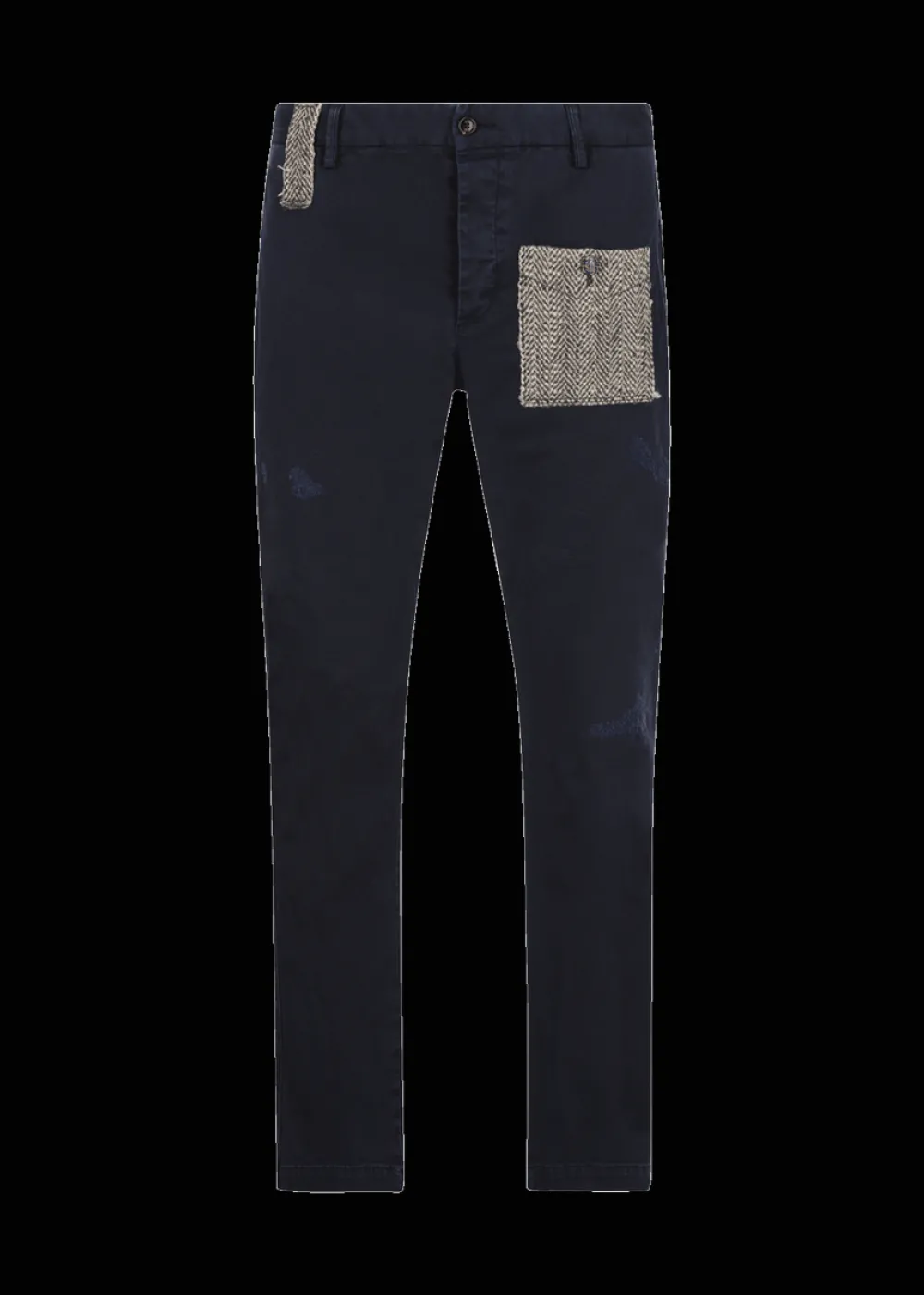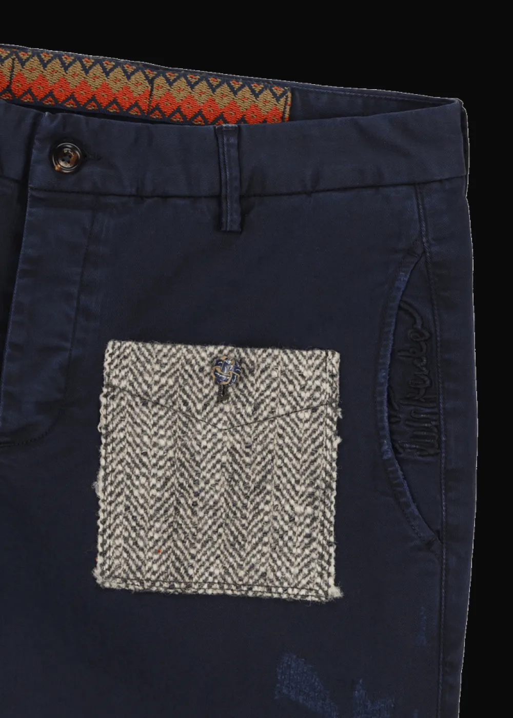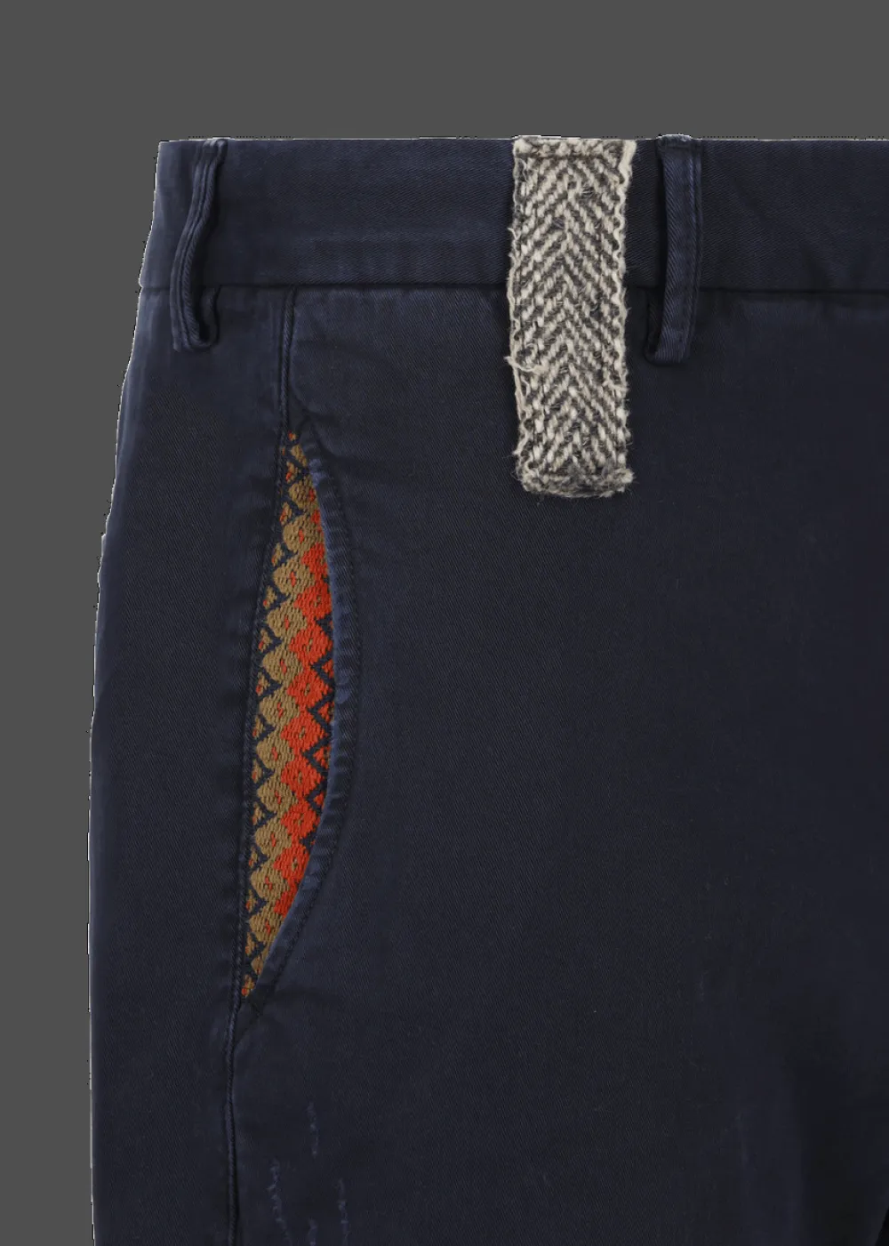 Taschen: Zwei seitliche Taschen, zwei Paspeltaschen hinten und eine aufgesetzte Pattentasche im Kontraststoff mit Knopfverschluss - Besonderheiten: Angenehmes Stretchgewebe, Waschung im Used Look, Knöpfe aus echter Steinnuss, geflochtener Lederknopf an der Pattentasche im Kontraststoff, Jacquard-Band mit Ethno-Muster hinten an der Innenseite des Bunds, gesticktes Luis Trenker Logo Ton in Ton an der linken Tasche
