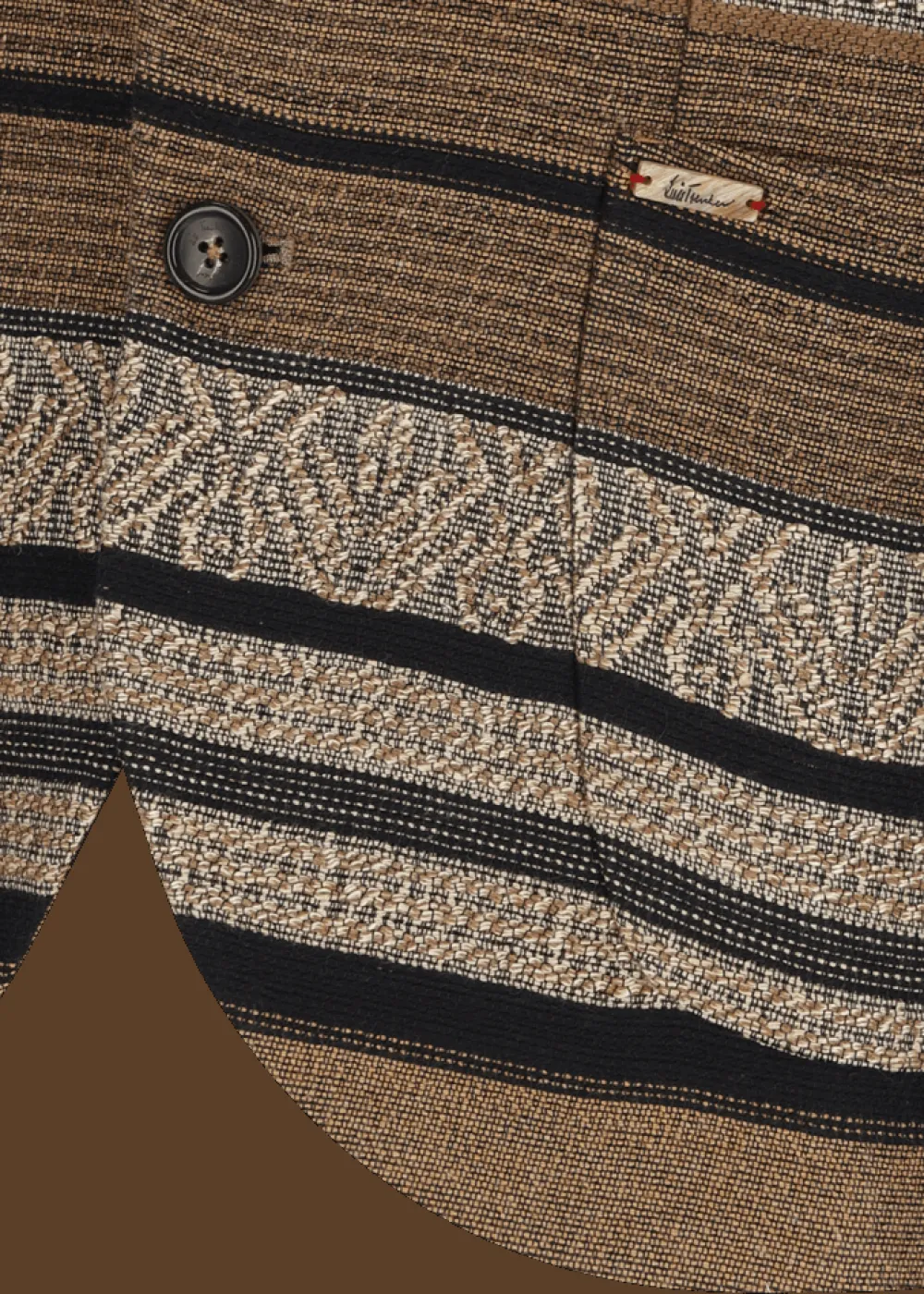 Herkunft: Stoff aus Italien, in Italien gefertigt - Besonderheiten: Einzigartiges Jacquard-Streifenmuster, Jacquardband mit Ethnomotiv an der Krageninnenseite, Logoplakette in Hornoptik an der linken Tasche