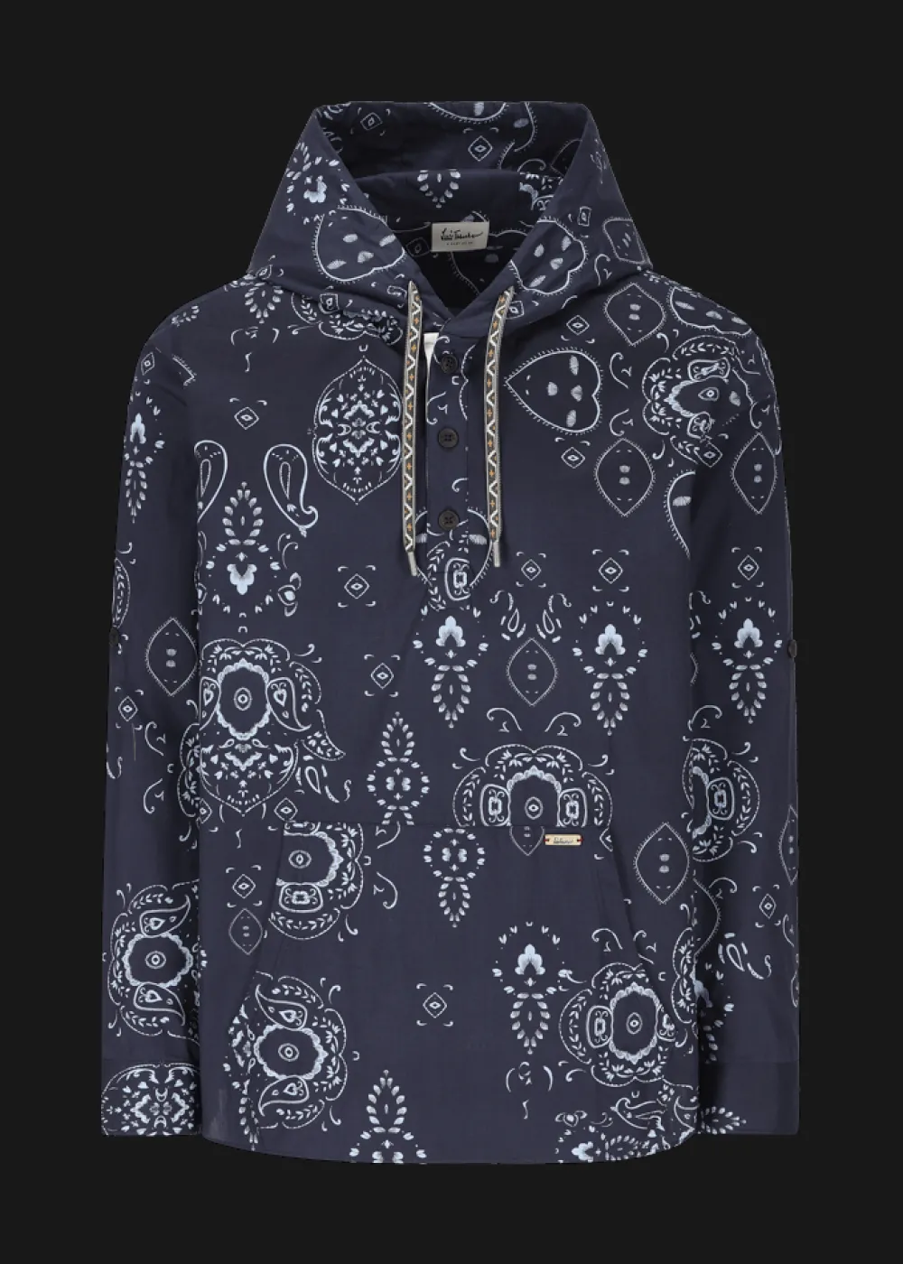 - Dieses Hemd im Comfort Fit mit Kapuze und kurzer Knopfleiste besteht aus reiner Baumwolle mit exklusiv für Luis Trenker designtem Bandana-Print. Die Kordel im Ethno-Look an der Kapuze, die Kängurutasche am Bauch und die Knöpfe aus echter Steinnuss machen dieses Modell zu einem Lieblingsteil für jeden Tag.