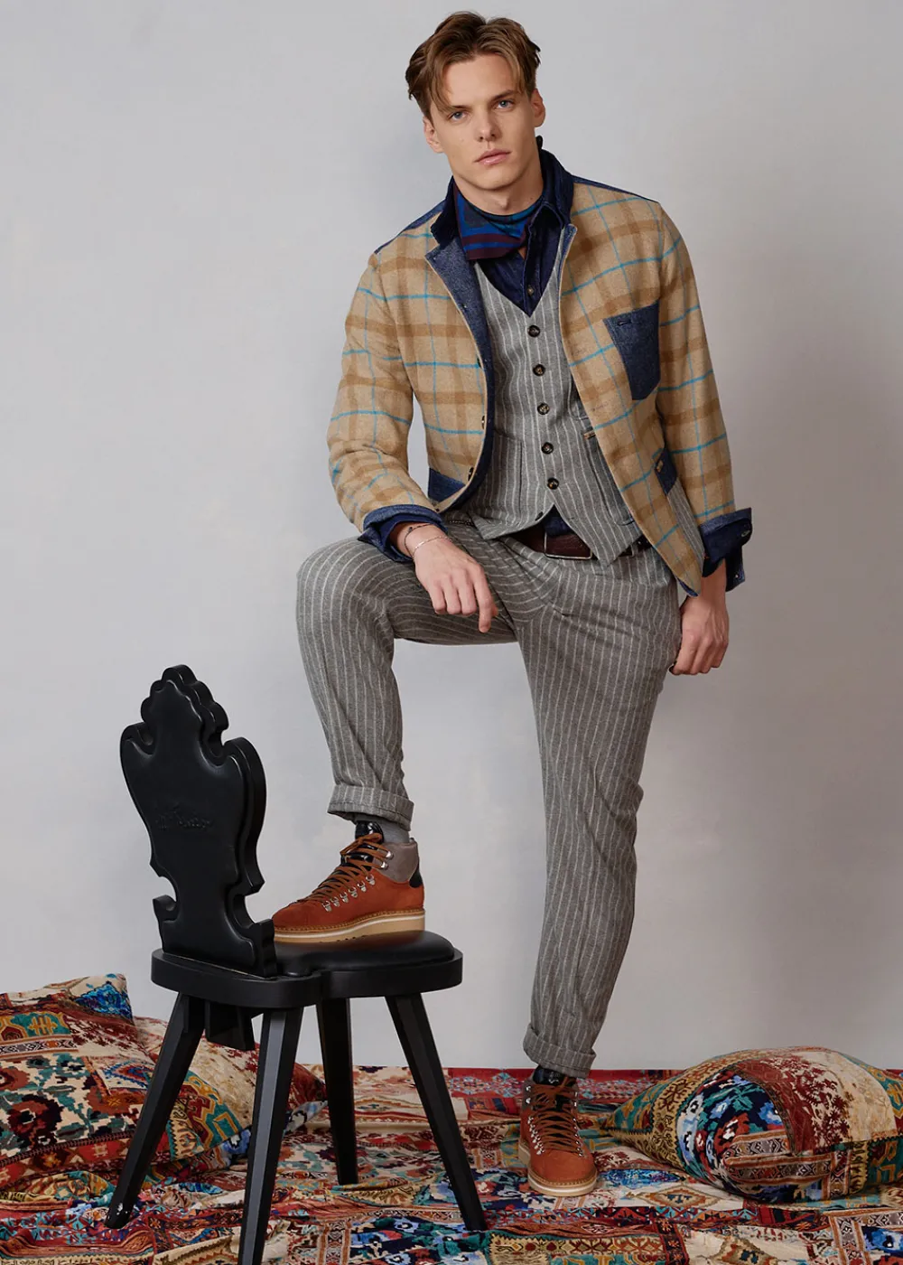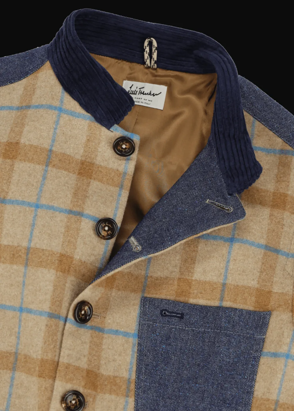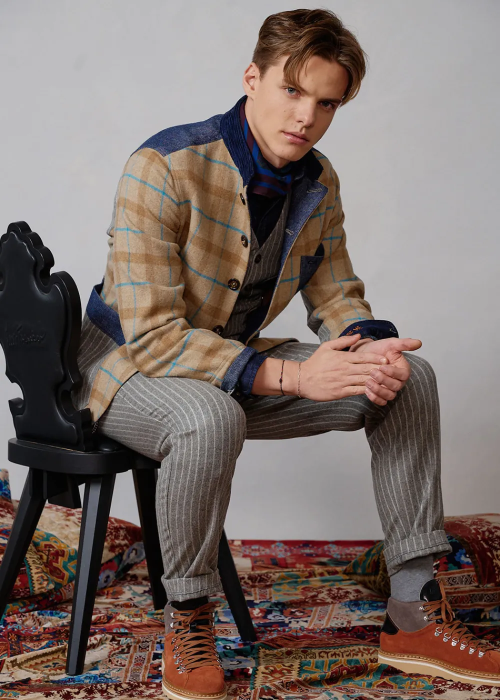 - Dieser vollständig gefütterte Blazer im Comfort Fit mit Stehkragen besteht vorne aus einem Wollmix mit exklusiv für Luis Trenker designtem Karomuster. An Rücken und Taschen, sowie an der Unterseite der Ärmel wurde reine Schurwolle mit Nadelstreifen verarbeitet, während Details aus Twill und Cord den Materialmix komplett machen.