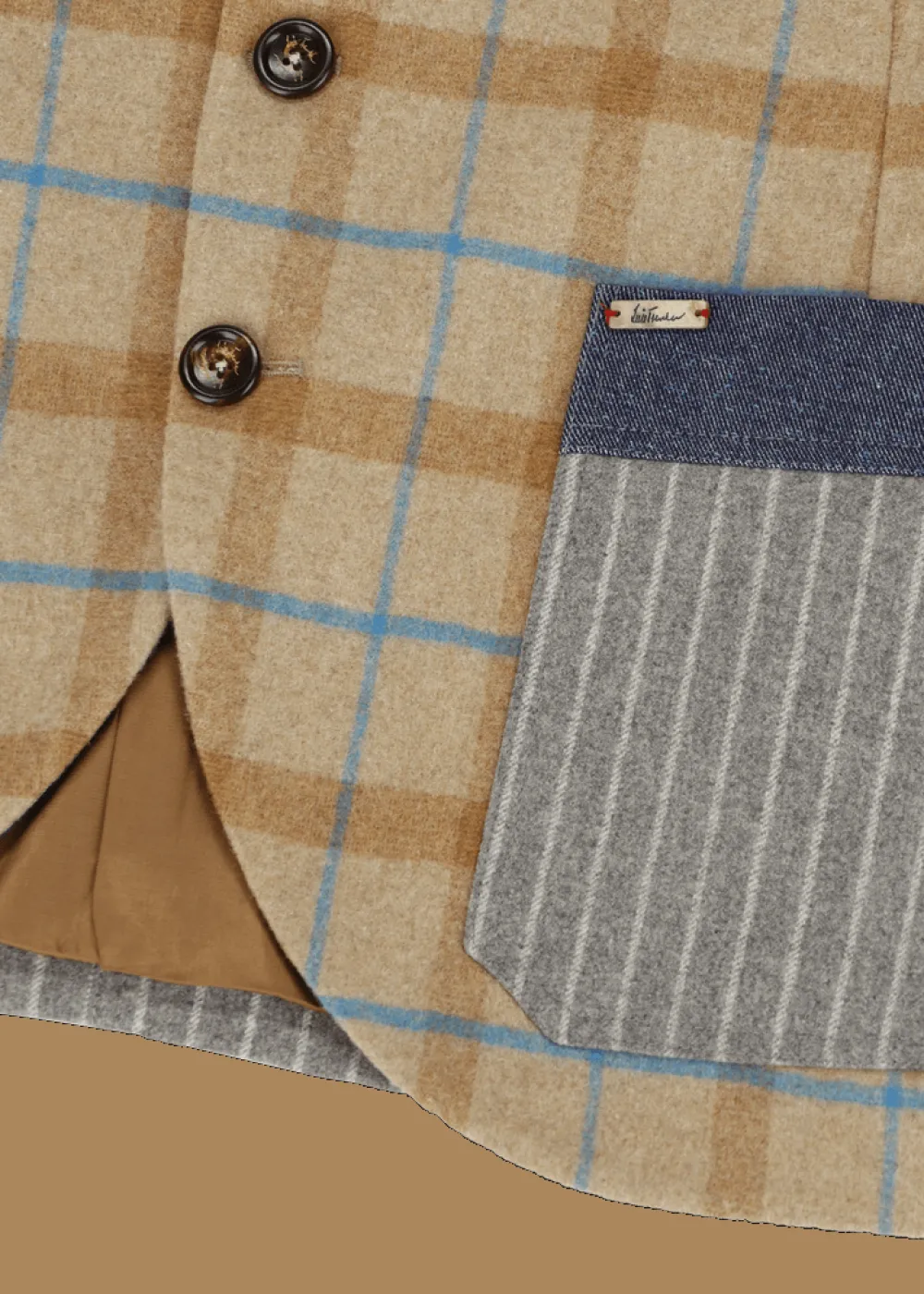 Herkunft: Stoff aus Italien - Besonderheiten: Rücken und Taschen aus reiner Schurwolle mit Nadelstreifen, exklusiv für Luis Trenker designter und gefertigter Wollmix mit Karomuster vorne, Twill-Einsätze an Taschen, Brusttasche und hinterem Schulterbereich, Logoplakette in Holzoptik an der linken Tasche
