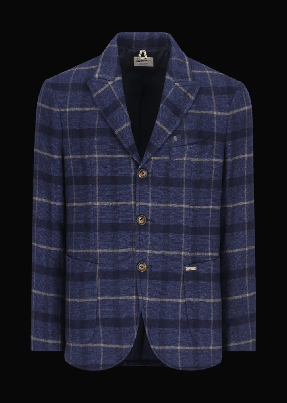 - Dieser halbgefütterte Blazer im Regular Fit mit Reverskragen besteht aus einer angenehmen Wollmischung mit Karomuster, die exklusiv für Luis Trenker gefertigt wurde. Ebenso einzigartig und exklusiv ist auch das Innenfutter im Schulterbereich, welches mit einem Ethno-Print im Patchwork-Stil besticht.