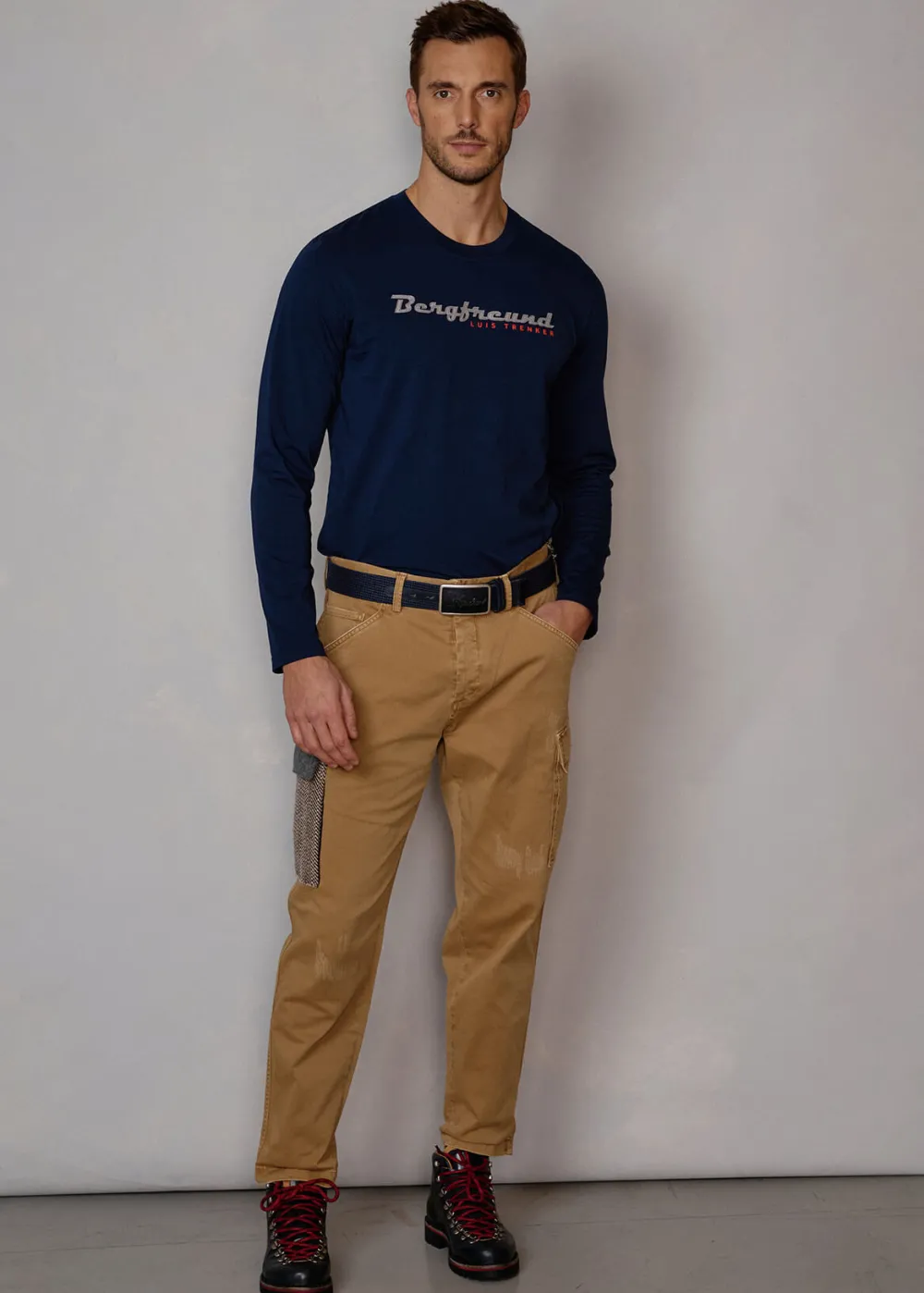 - Dieses T-Shirt im Regular Fit mit langen Ärmeln und Rundhalsausschnitt besteht aus reiner Baumwolle und ist mit dem gelaserten Schriftzug „Bergfreund“ als Applikation an der Brust ein Muss für alle Fans alpiner Abenteuer.