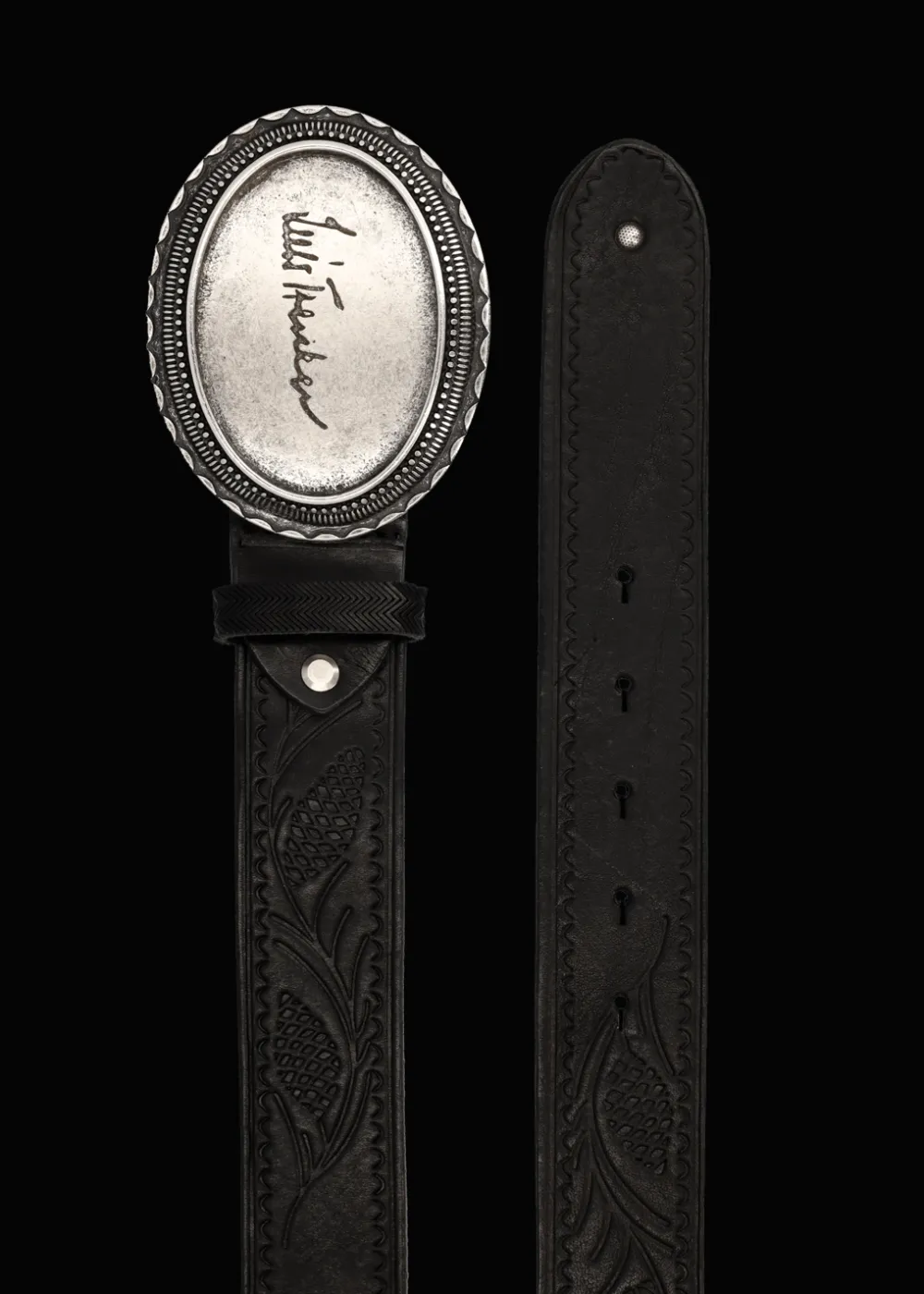 - Dieser Gürtel aus echtem Glattleder ist mit seinem reliefartigen, gelaserten Muster und seiner großen ovalen Schnalle mit Verzierung ein ganz besonderes Accessoire im Folklore-Stil.