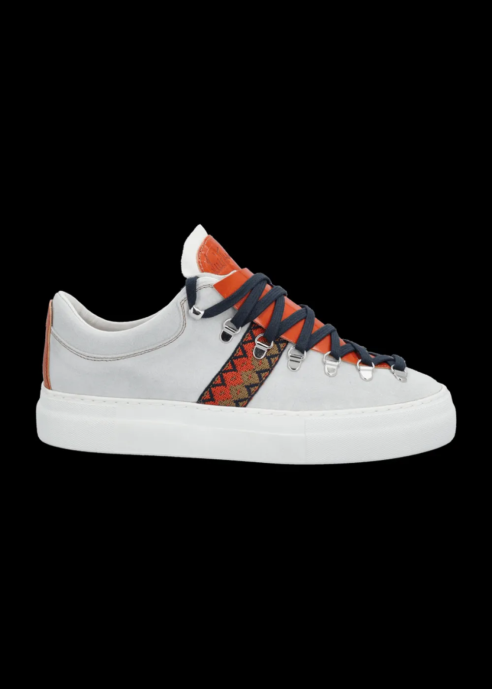 - Dieser handgefertigte Sneaker aus echtem Glattleder mit Wildledereinsatz erhält durch ein Jacquardband mit buntem Ethnomuster einen originellen Touch.