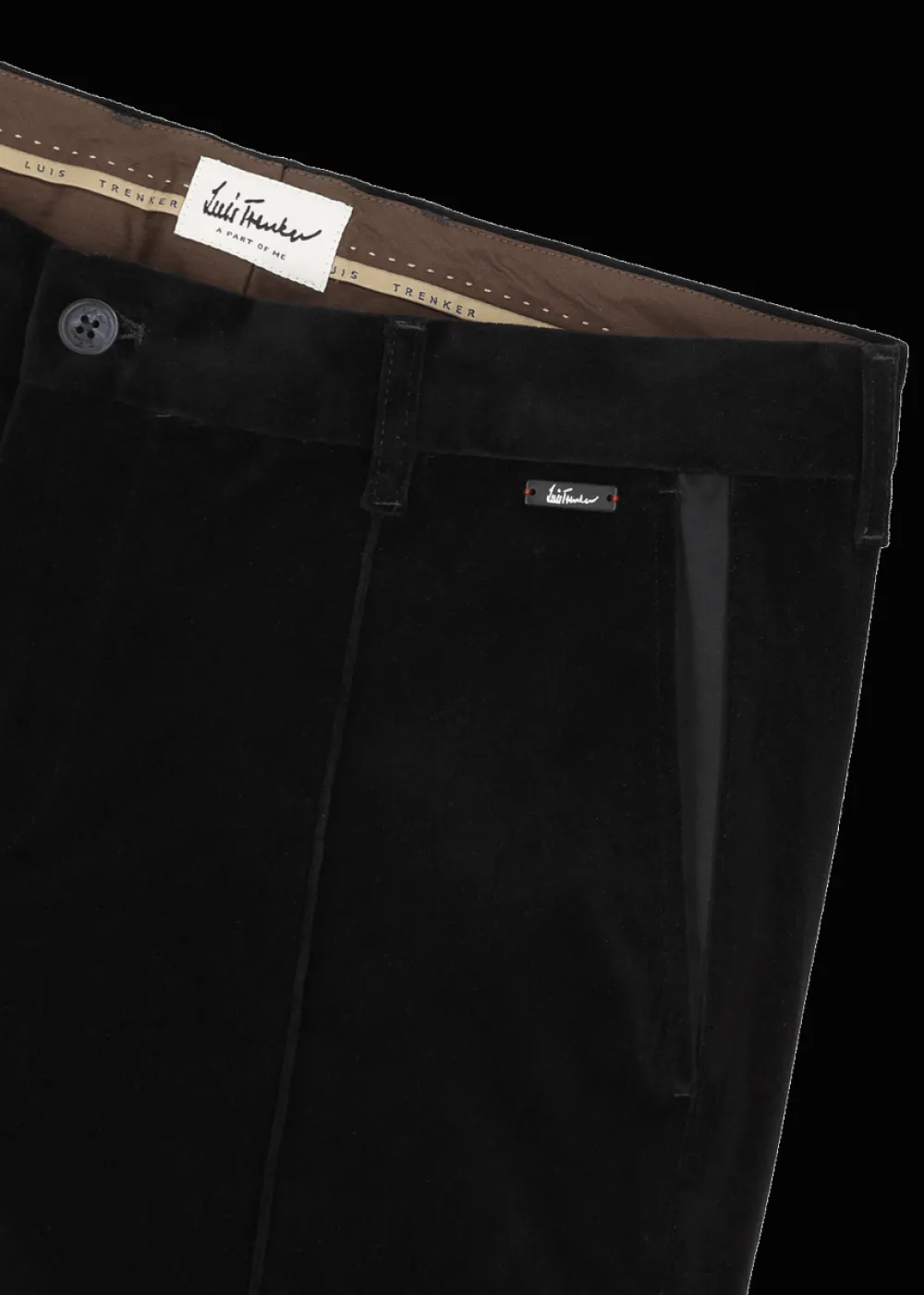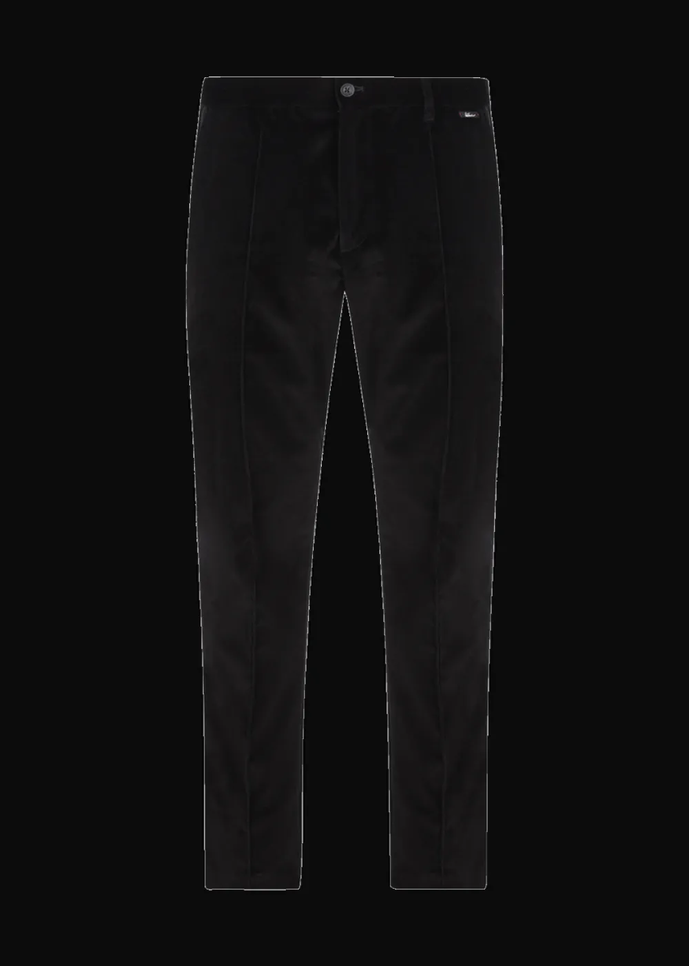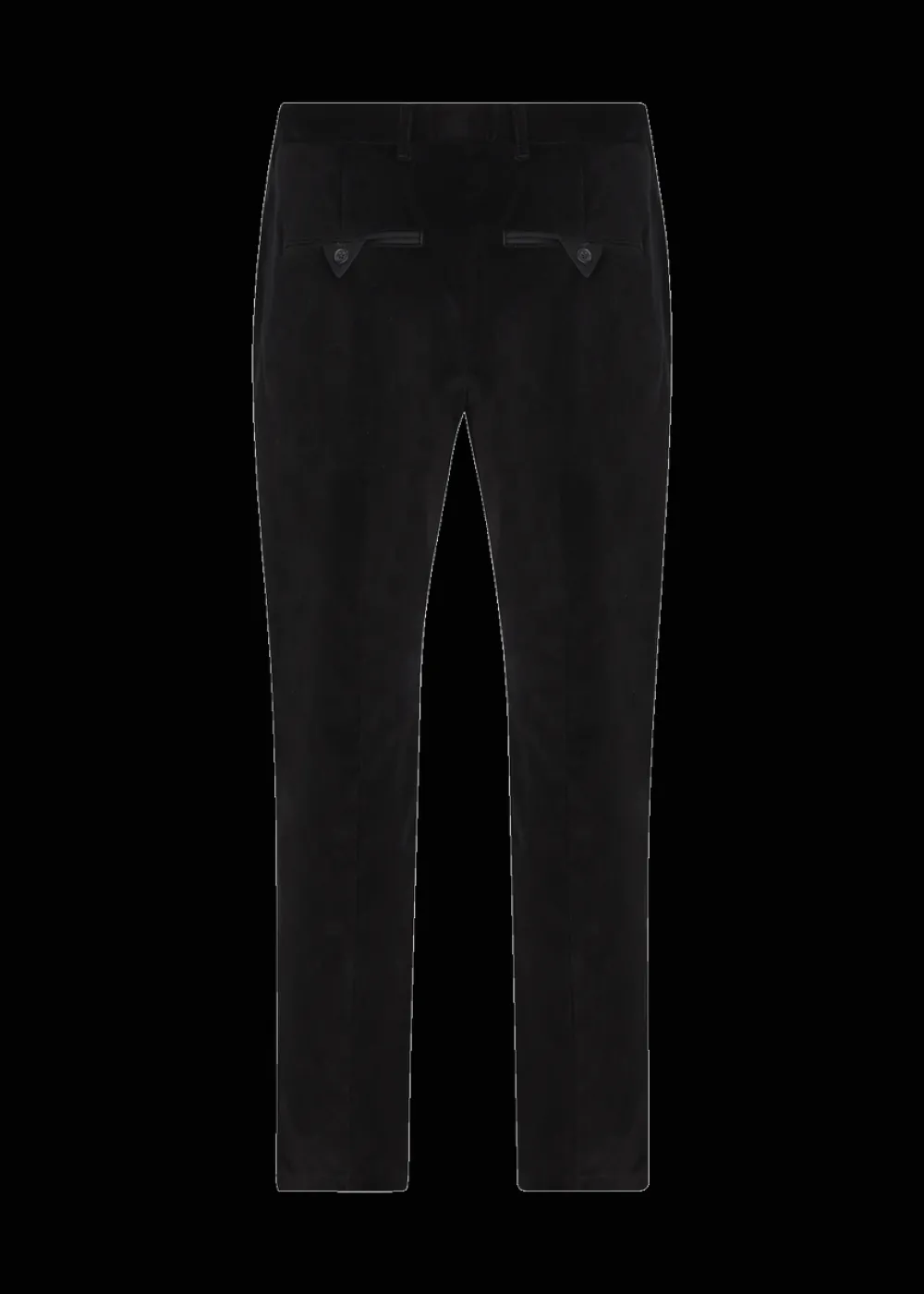 Taschen: Zwei seitliche Taschen, zwei Paspeltaschen mit Knopfverschluss hinten - Besonderheiten: Weicher Samt mit matten Satin-Einsätzen, Knöpfe aus Bio-Horn, mittig verlaufende, leicht hervorstehende Naht am Vorderbein, schwarze Logoplakette an der linken Hüfte