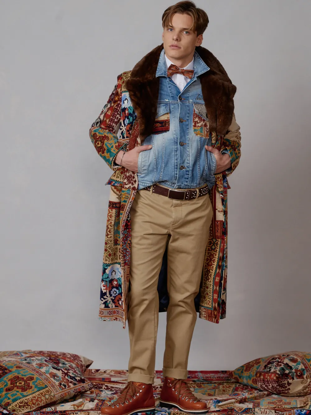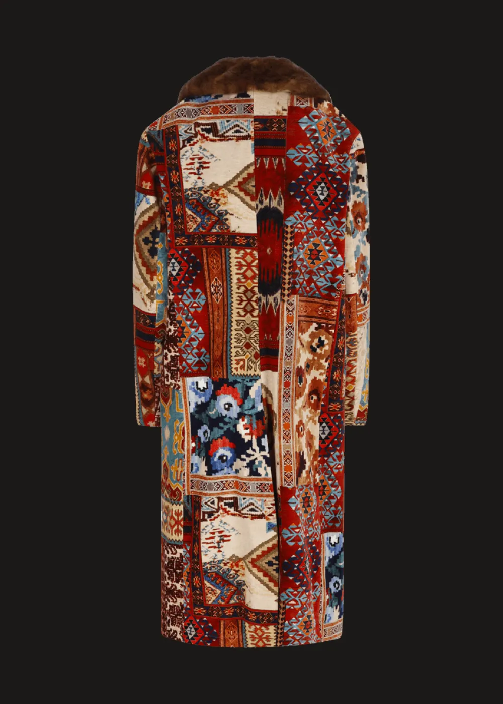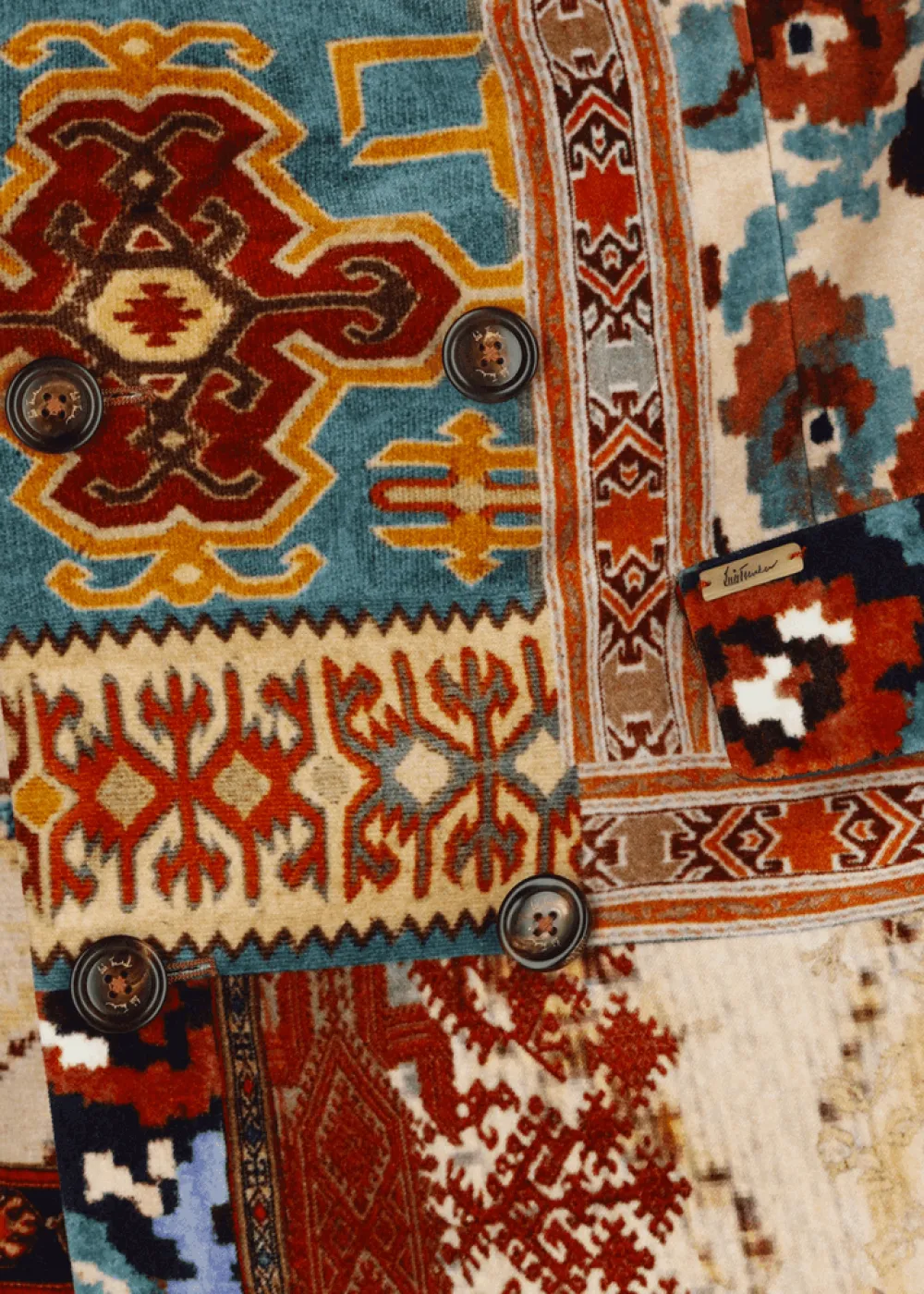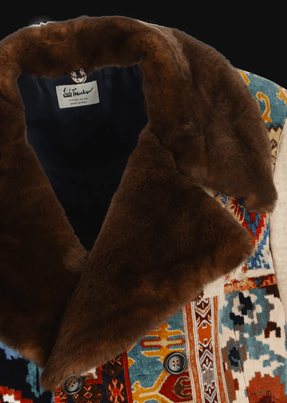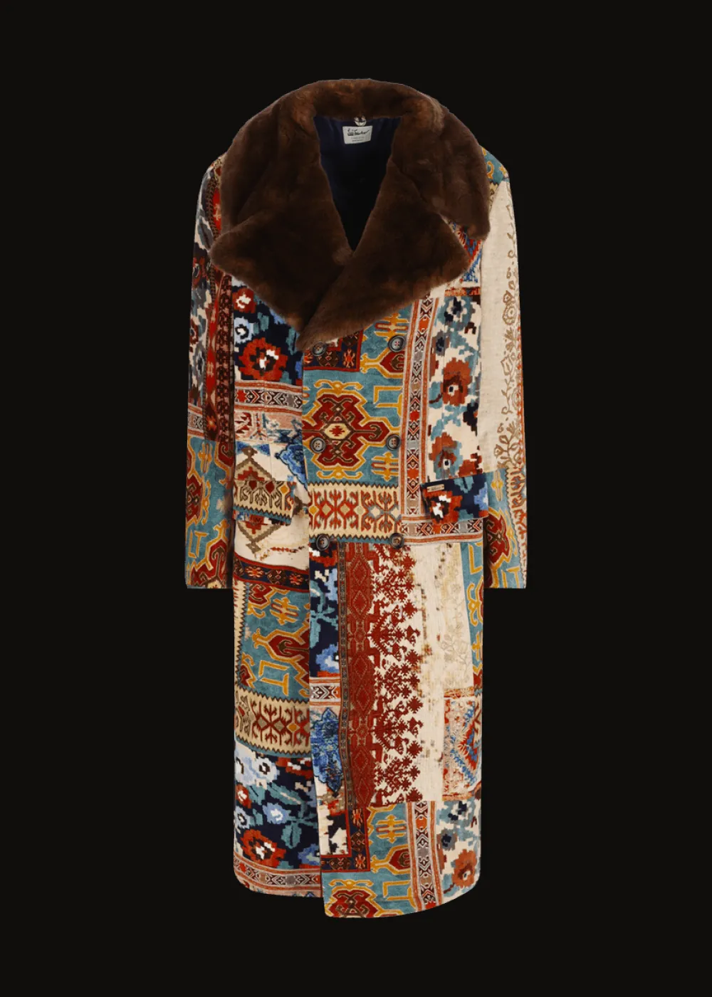 - Dieser vollständig gefütterte und leicht wattierte Mantel besteht aus einem exklusiv für Luis Trenker designten und gefertigten Samt mit auffälligem Patchwork-Print. Die doppelte Knopfleiste mit Echthornknöpfen und der Reverskragen aus kuscheligem Kaninchenpelz runden das extravagante Erscheinungsbild ab.