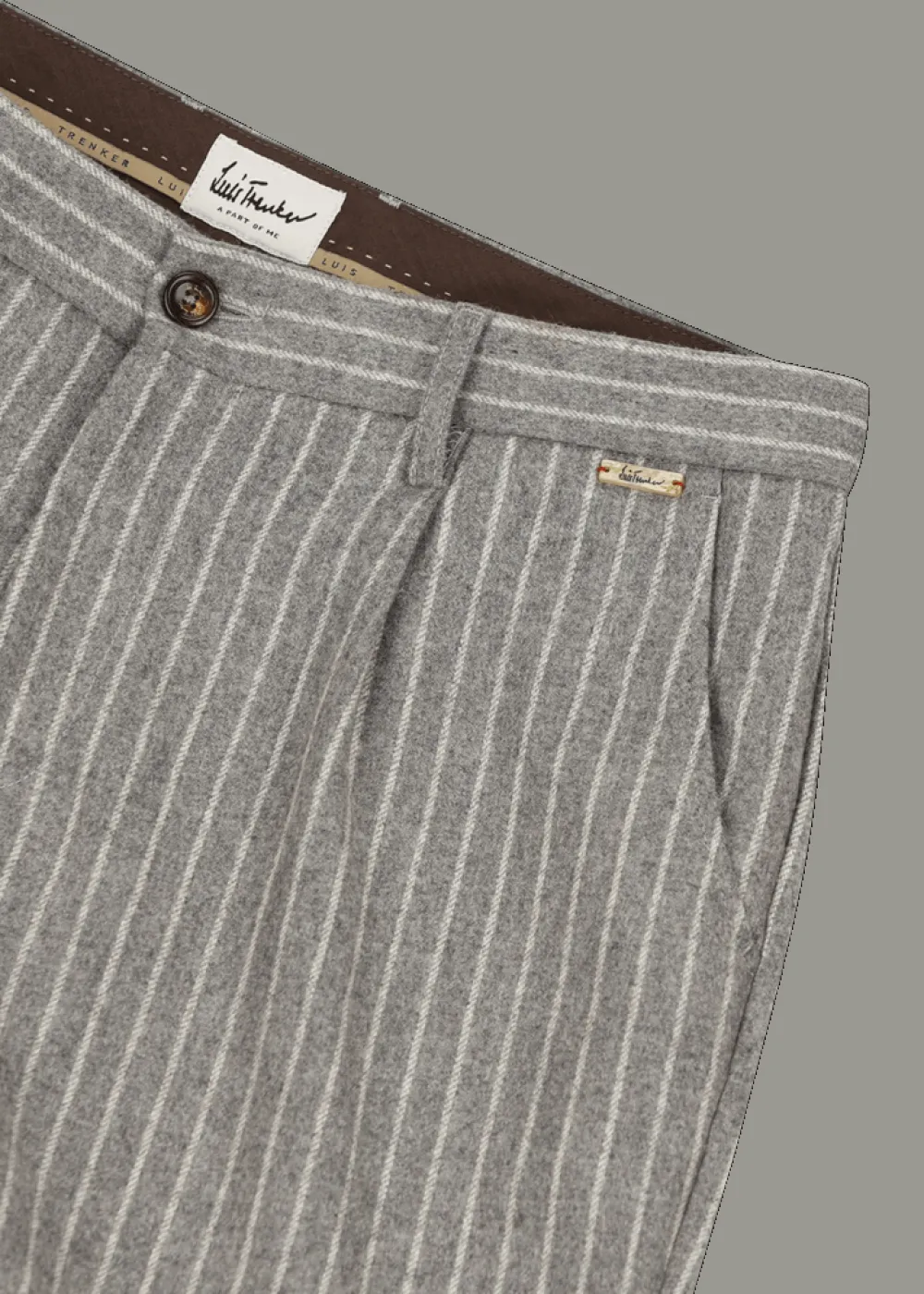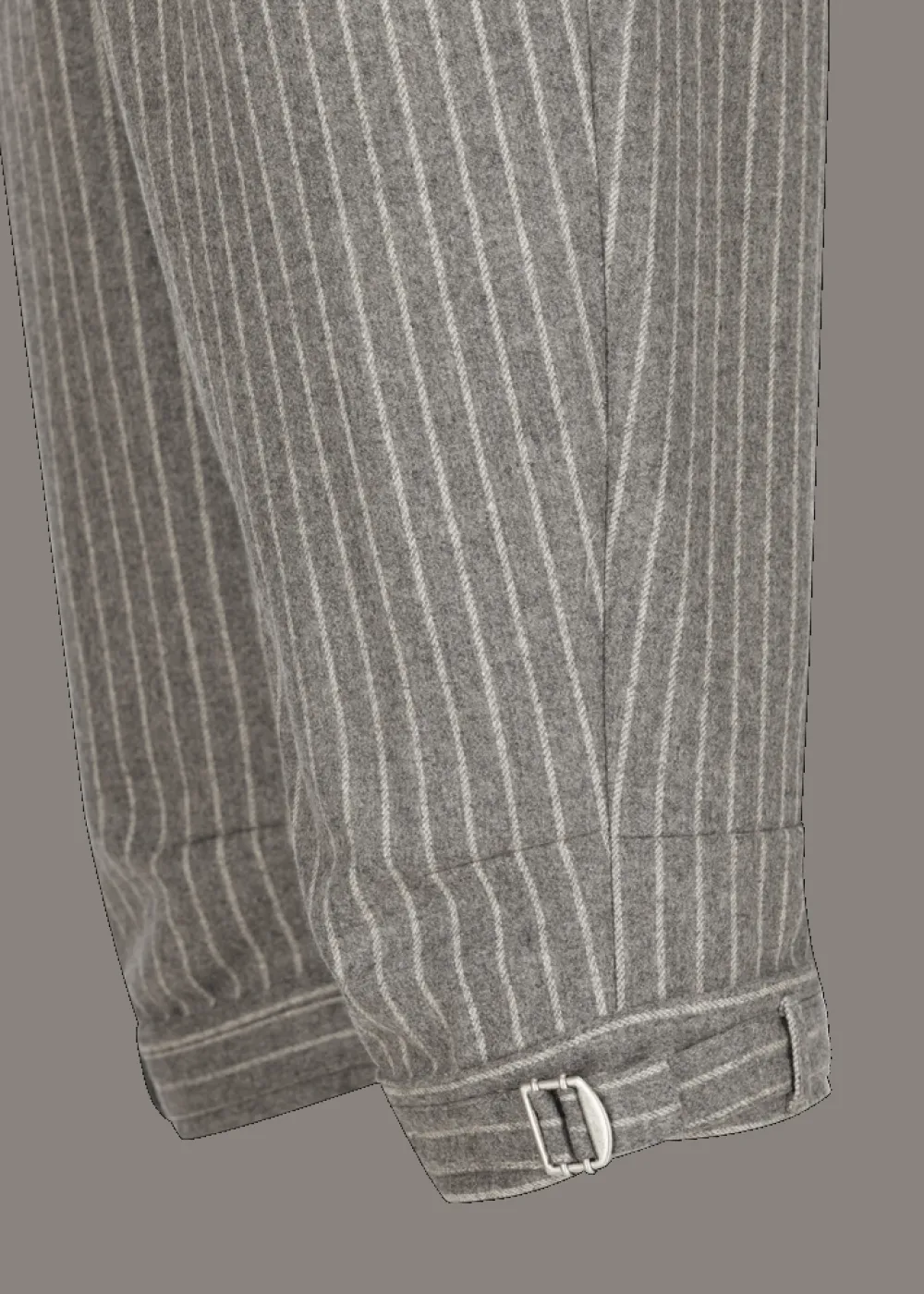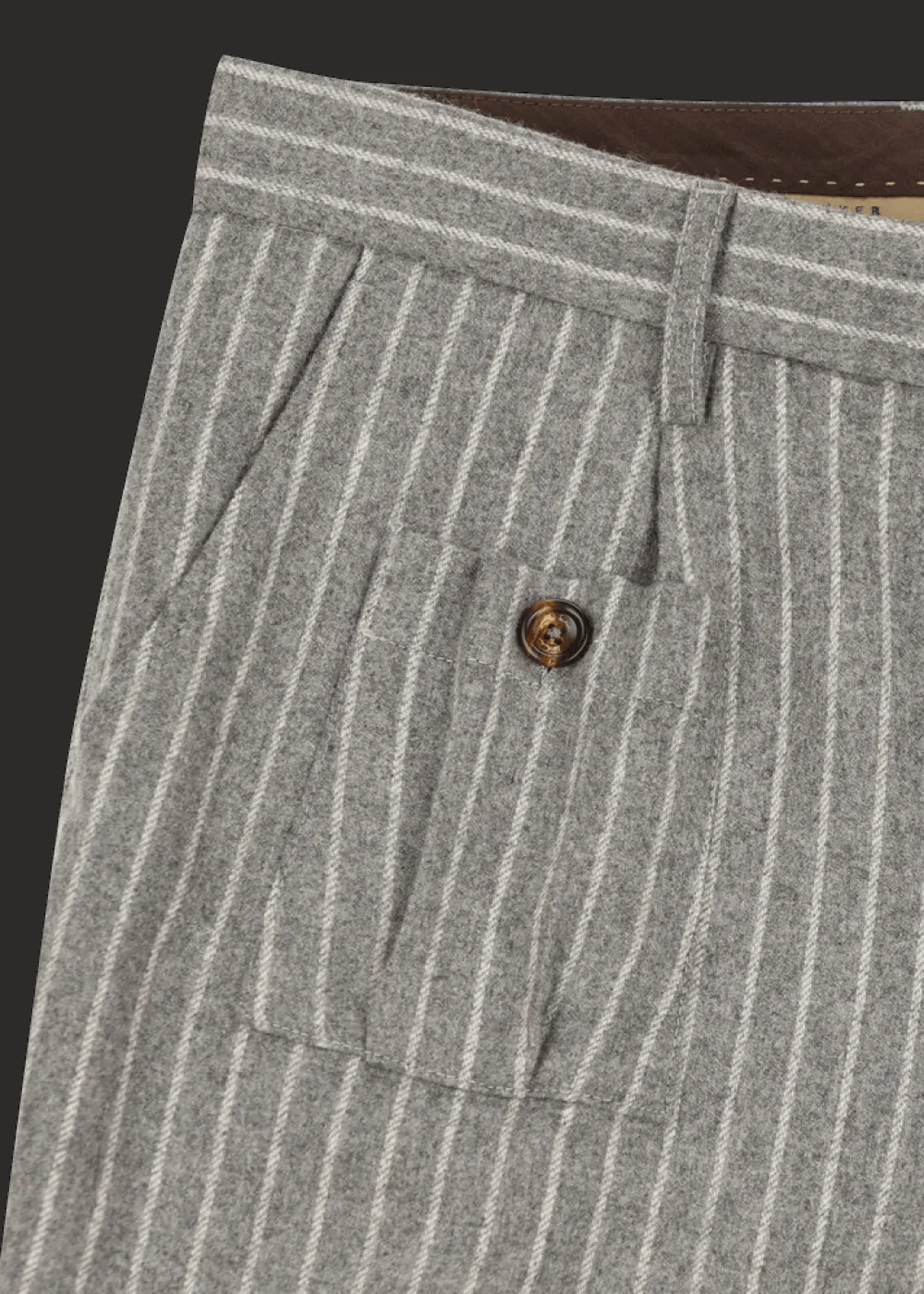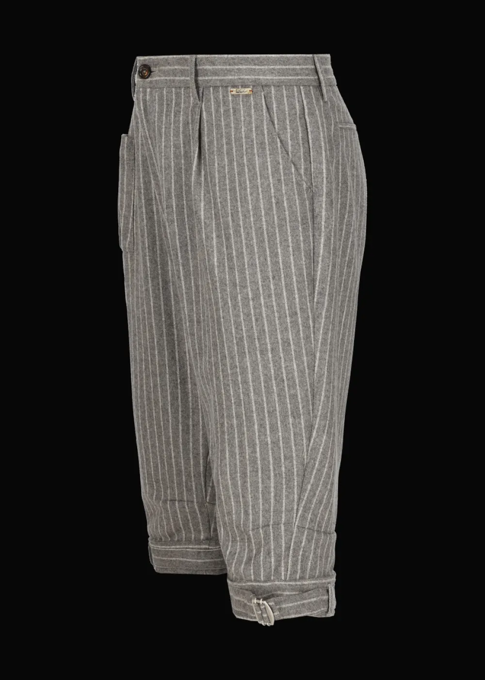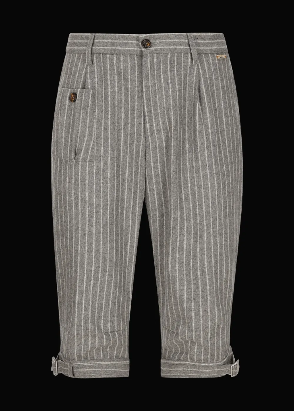 Herkunft: Stoff aus Italien - Besonderheiten: Knöpfe aus Echthorn und Bio-Horn, Bundfalten, Beinsaum durch eine Schnalle in der Weite regulierbar, schwarze Logoplakette links am Hosenbund