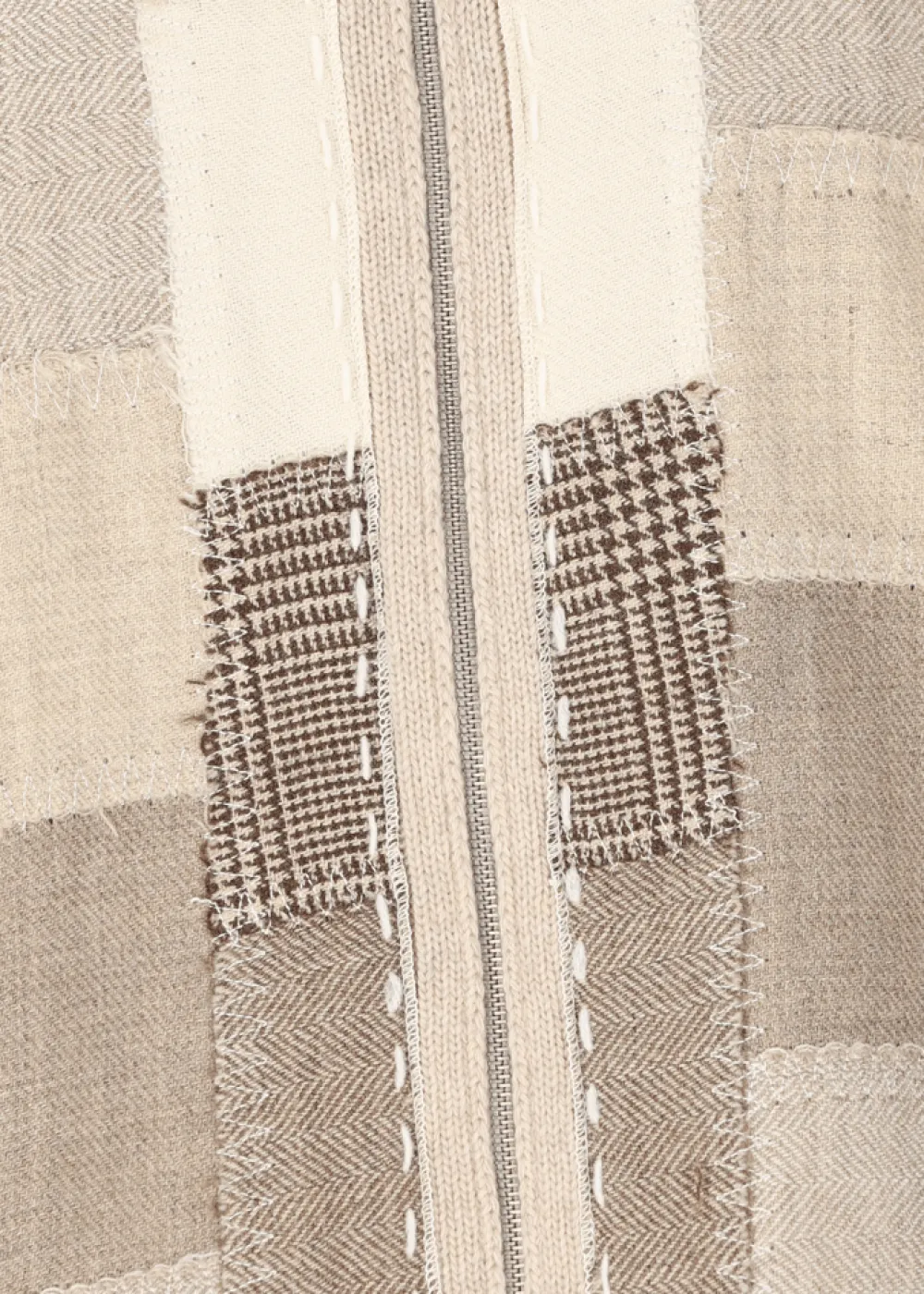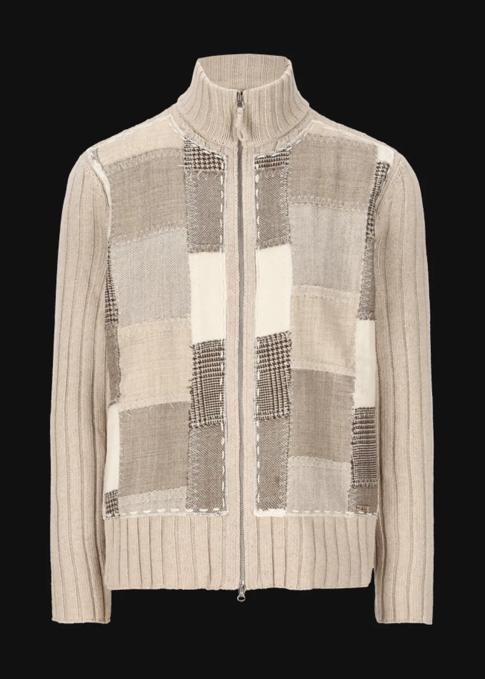 - Diese Strickjacke im Regular Fit mit Stehkragen und Zwei-Wege-Reißverschluss besteht aus einer angenehmen Wollmischung im breiten Rippstrick. Die Vorderseite im Patchwork-Look ist ein einzigartiges Kunstwerk aus gleich sechs verschiedenen Stoffen, die in Handarbeit vernäht wurden. Hier sind einzelne hervorstehende Fäden kein Defekt, sondern ein gewollter Effekt, der den Charme dieser Strickjacke unterstreichen soll.
