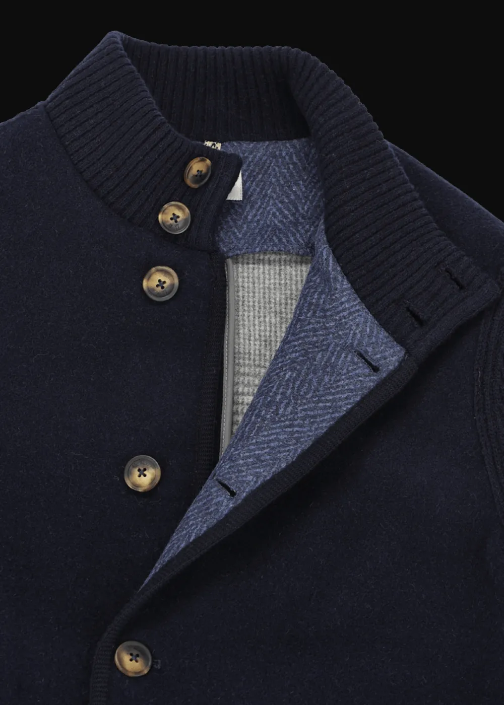Herkunft: Stoff aus Italien, in Italien gefertigt - Besonderheiten: Ärmel und Kragen aus reiner Schurwolle im Rippstrick, Knöpfe aus echter Steinnuss