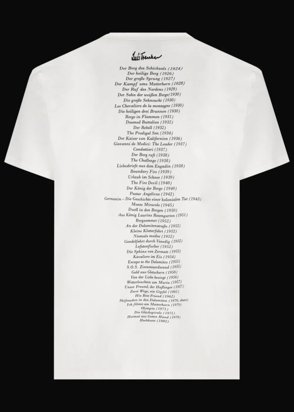 - Dieses T-Shirt im Regular Fit mit kurzen Ärmeln und Rundhalsausschnitt besteht aus reiner Baumwolle und besticht durch ein stilisiertes Luis Trenker Porträt mit dekorativen Elementen als Print auf der Brust. Am Rücken hingegen befindet sich Luis Trenkers Filmografie als All-Over-Print.