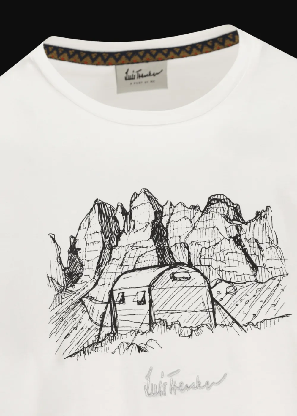 - Dieses T-Shirt im Regular Fit mit kurzen Ärmeln und Rundhalsausschnitt besteht aus reiner Baumwolle und spiegelt mit seinem originellen Print in skizzierter Optik, der eine Südtiroler Bergkette und ein Biwak zeigt, unsere Liebe zu den Bergen wider.
