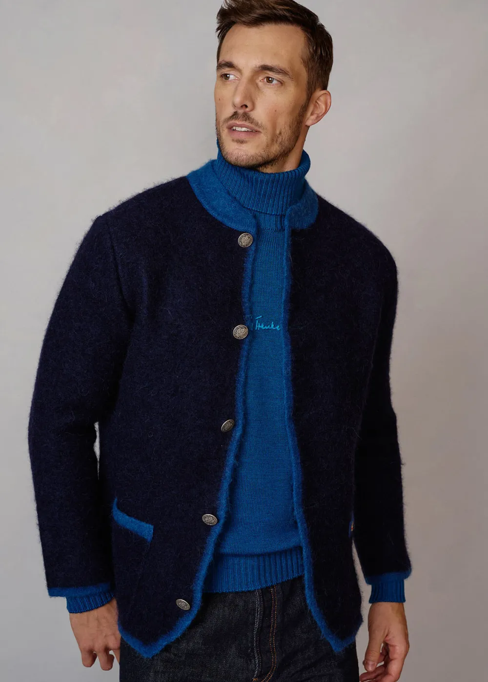 Good to know: Damals wie heute ist das wichtigste Merkmal dieser Walkjacken, dass die Rohwolle zunächst zum Faden gesponnen, auf Handstrickmaschinen verarbeitet und anschließend gewalkt wird. Alle anderen Walkjacken werden zuerst als Stoff gewalkt, dann erst geschnitten und konfektioniert. - Unser Model Federico ist 1,88 m groß und trägt Größe L.