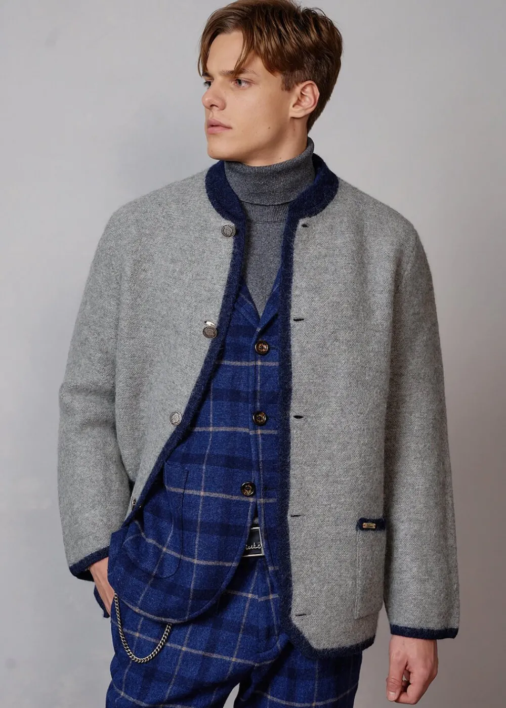 - Diese Outdoor-Walkjacke im Oversized Fit mit Stehkragen besteht aus einer warmen Mischung aus Alpaka- und Schafwolle. Sie ist eine moderne Interpretation des traditionellen Hofer-Jankers, welcher ab der Mitte des 20. Jahrhunderts in Salzburg auf ganz besondere Weise gefertigt wurde. Ihre von Natur aus windabweisende Funktion, ihre Bordüren in Kontrastfarbe und ihre edlen metallischen Knöpfe machen sie zum Herzstück unserer Outerwear.