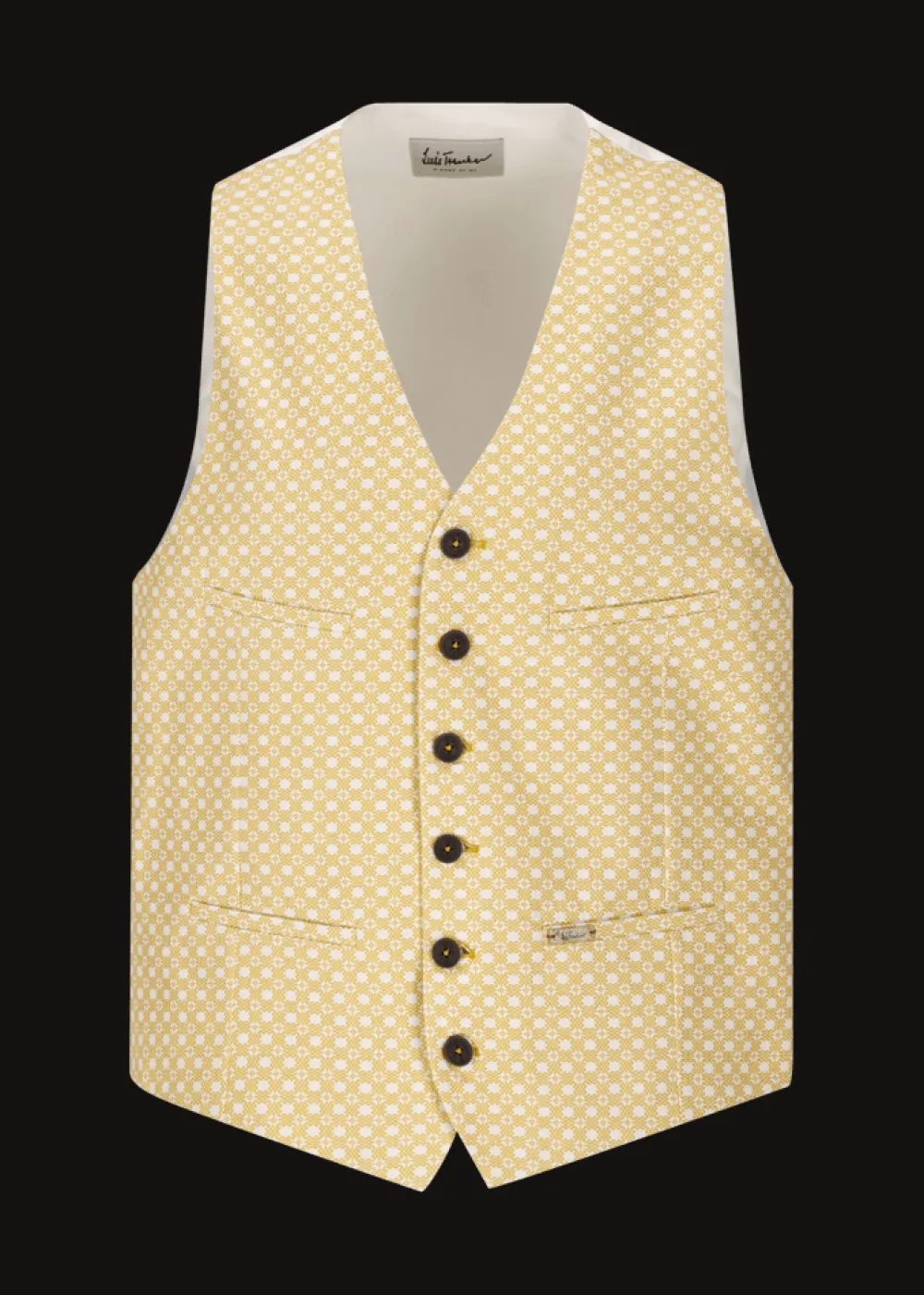 - Diese einreihige, in Italien gefertigte Weste im Regular Fit mit V-Ausschnitt besteht aus reiner Baumwolle, verarbeitet zu einem hochwertigen Jacquard mit auffälligem geometrischem Muster. Bei aller Extravaganz dürfen zeitlose, klassische Details, wie die hochwertigen Knöpfe aus echter Steinnuss und die dezenten Paspeltaschen, nicht fehlen.