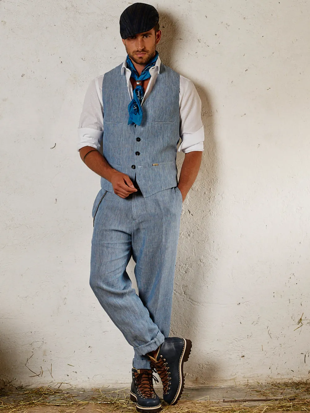 Besonderheiten: Hochwertiges Leinen in melierter Optik, Rücken aus reiner Baumwolle, Logoplakette in Hornoptik an der linken Tasche, durch Schnalle am Rücken in der Weite regulierbar - Unser Model Valentin ist 1,82 m groß und trägt Größe 50.
