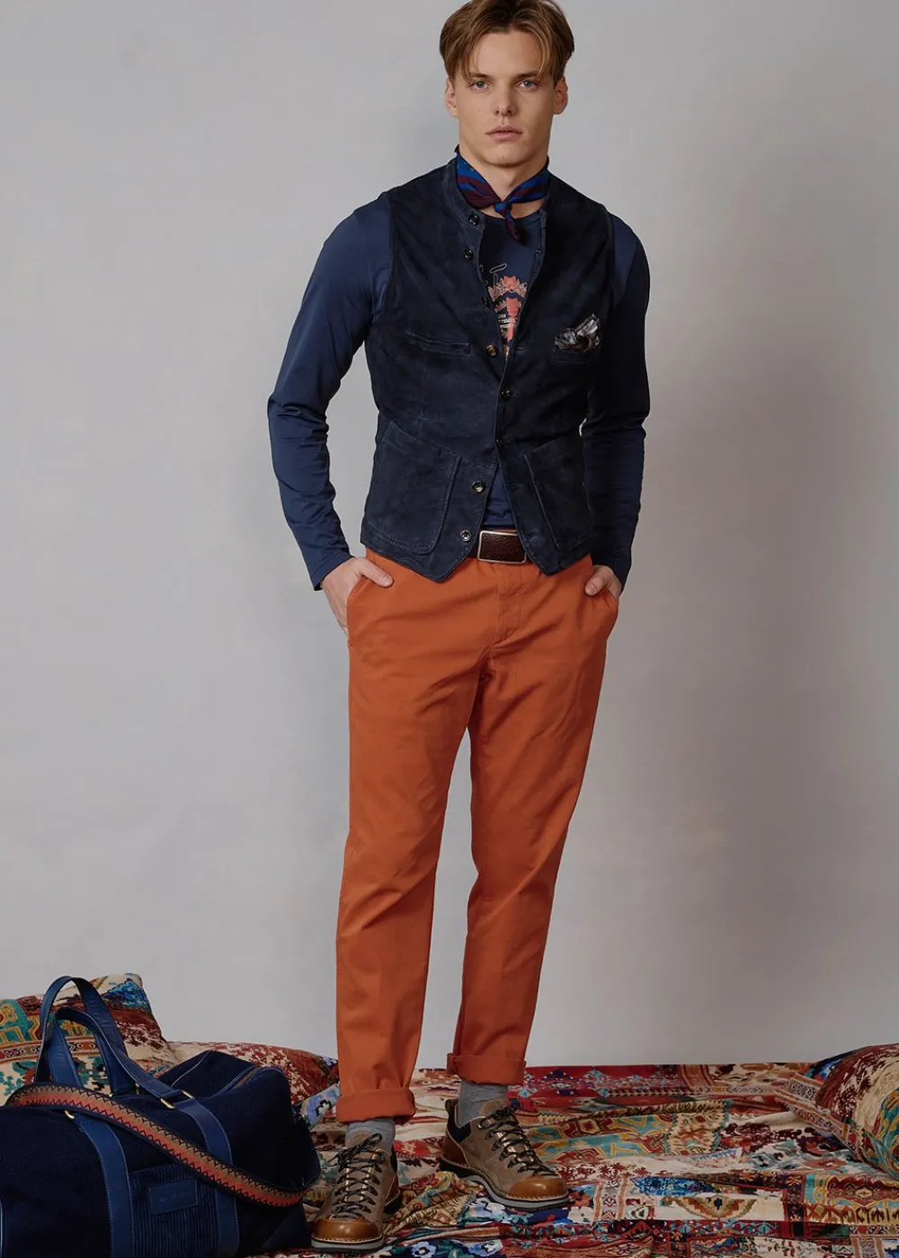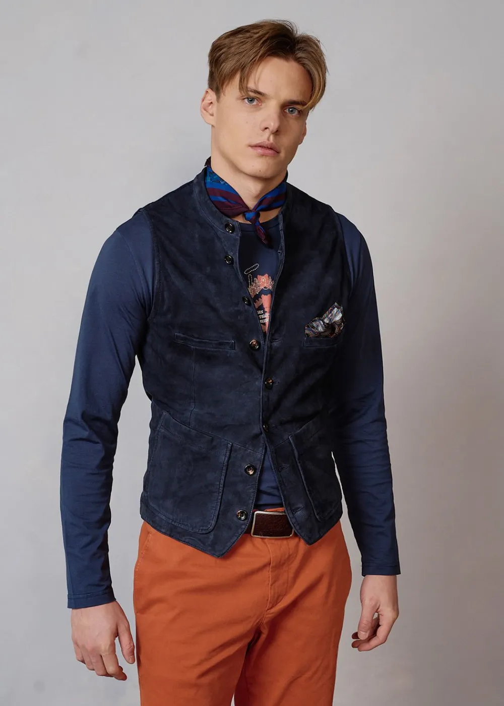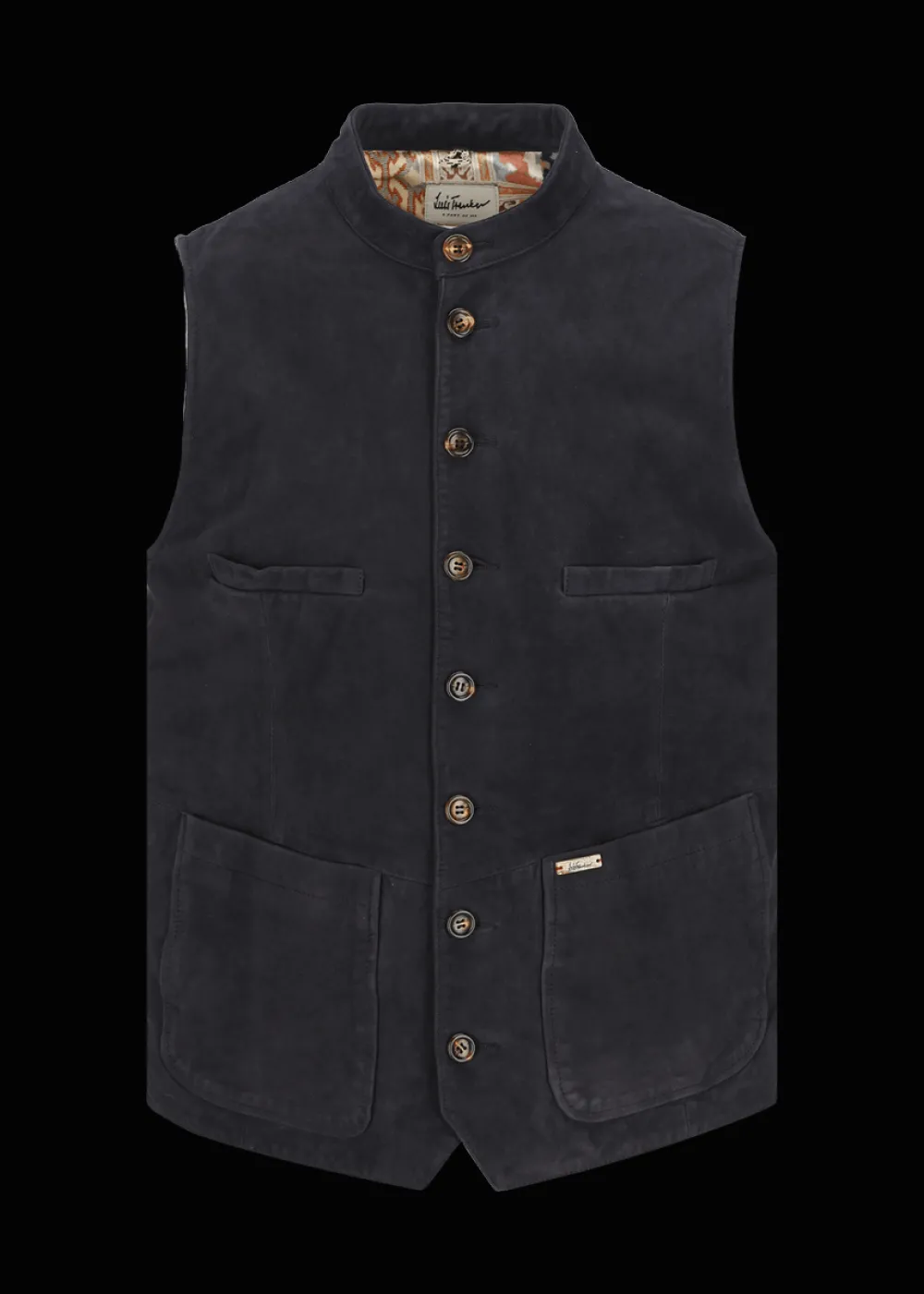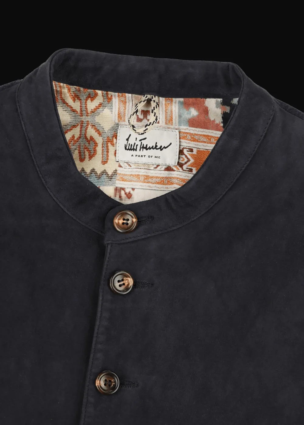 - Diese einreihige, hochgeschlossene Weste im Regular Fit besteht vorne aus echtem Veloursleder und hinten aus Walk. Das Leder wurde so behandelt, dass es einen natürlichen Vintage-Effekt erhält. Das Satin-Innenfutter trägt den exklusiv für Luis Trenker designten Ethno-Print im Patchwork-Stil.